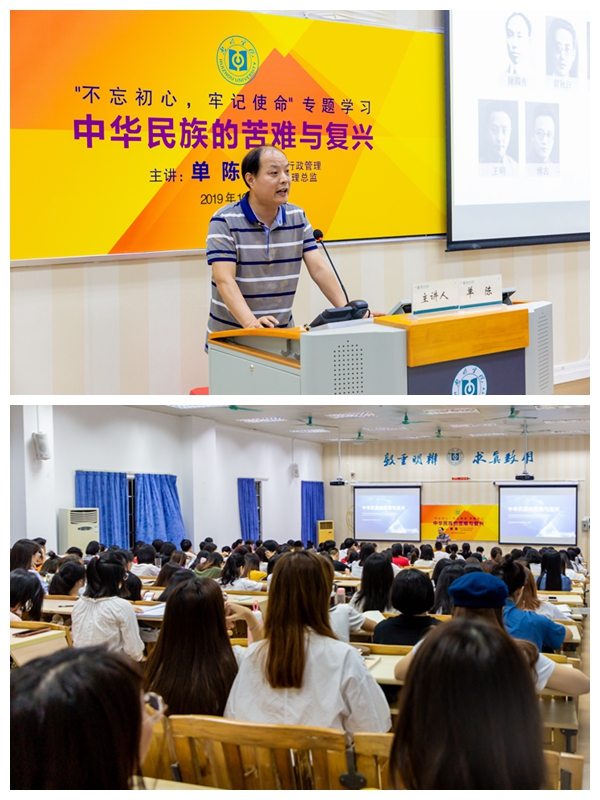 10月16日晚,学院在服装楼101阶梯教室开展“不忘初心、牢记使命”主题教育第五次专题学习。学院党建共建单位旭日集团行政管理办公室助理总监单陈同志应邀主讲《中华民族的苦难与复兴》。学院领导班子、全体师生党员、入党积极分子约200人参加学习。学习由学院党总支书记曾裕林主持。单陈以民族的历史、苦难、选择与复兴四个方面为切入点,使同学们对中华民族所经历的苦难与复兴有了更深刻的认识与理解。他指出,在四大文明古国中,中国是唯一一个文明历史文化延绵不断的国家,主要源于中国古代史上有着多个大统一的局面奠定下深厚的基础,并以苦难的起源“鸦片”引入第二个主题——鸦片导致我国战斗力下降,白银迅速流失,使整个国家陷入深渊。单陈指出,在当时,要寻找中国的出路,不是一味的摒弃,而是取其精华去其糟粕;一次革命、二次革命、八年抗战、解放战争,这都是民族的选择,是中华民族走向复兴的选择。最后,单陈与师生们分享了祖国的复兴道路和使命,中国在世界上立下了一个又一个丰碑,这些成就来源于人民的力量。同时,单陈叮嘱同学们要坚定习近平总书记所提出的四个自信“道路自信、理论自信、制度自信、文化自信”,共创美好明天。曾裕林强调,希望同学们能够进一步认识到党的领导、国家的强大是我们坚实的后盾,通过对历史的学习,牢记革命先烈的付出,珍惜来之不易的时光,为国家、社会做出力所能及的贡献。