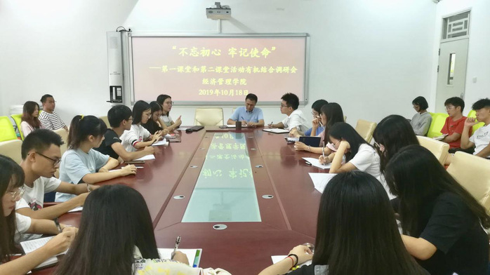 本网讯 10月18日下午,经济管理学院在教学实验大楼1508会议室开展了“不忘初心、牢记使命”主题教育之“第一课堂和第二课堂活动如何有机结合”调研会。学院党总支副书记郑党生、辅导员,学生会各部门部长参加调研会。
