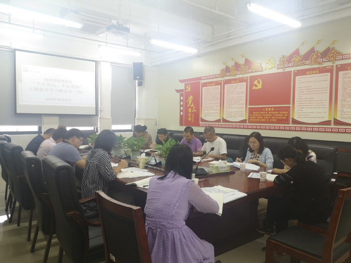 本网讯 10月21日上午,政法学院党总支在学院1608会议室召开“不忘初心、牢记使命”主题教育第四场专题研讨会,学院领导班子成员、各支部书记和组织员参加会议。会议由学院党总支书记、院长蒋炜主持。